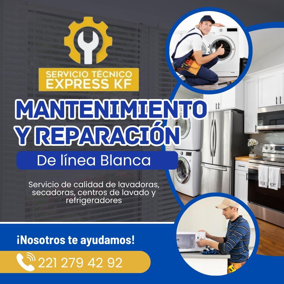 En Servicio Técnico Express KF somos una empresa especializada en el mantenimiento y reparación de electrodomésticos de línea blanca. Contamos con más de 20 años de experiencia, brindando soluciones rápidas, seguras y garantizadas en lavadoras, secadoras, refrigeradores, lavasecadoras, centros de lavado y sistemas de aire acondicionado.